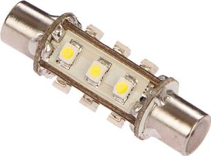 LED "pære" som erstatter lanternepærer festoon barrel. Denne sokkeltypen kjennetegnes ved av den har poler i begge ender, hvor begge polene har flat avslutning. Pæren er laget av premiumprodusenten NauticLed. Et typisk bruksområde for denne pæren er i hvittlysende lanterner. - Energiforbruk: 1,2 watt - Tilsvarer en halogenpære på 10 watt - Lystemperatur: 6000K (kaldhvit) - Lysstyrke: 120 lumen - Lyser 360 grader - Sokkel: Festoon (pinol) barrel (flate ender) - Inngangsspenning: 10-30 volt DC - Mål: Ø13 x 43 mm
