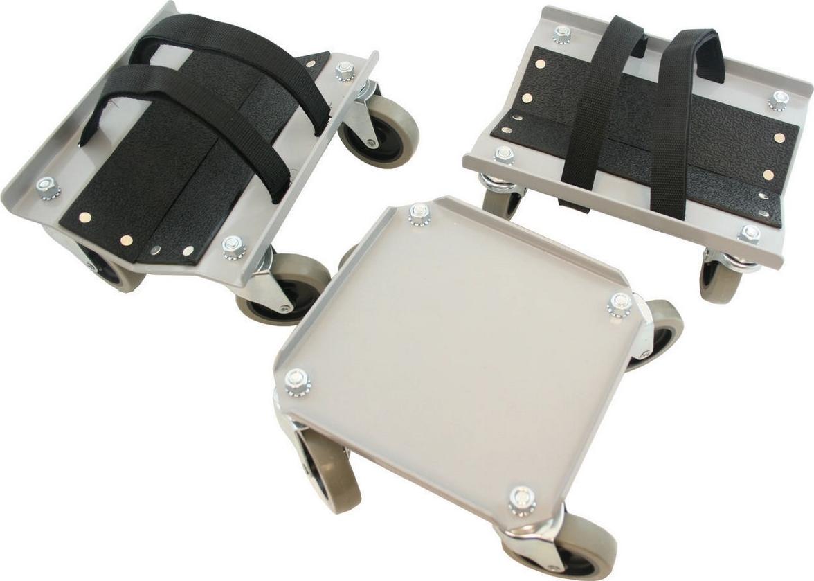 Premium hjulsett i kraftig stålkonstruksjon for enkel flytting av snøscooter på gulv eller flatt underlag. Hjulsettet har store gummierte hjul som ruller godt, og stropper med borrelås for å sikre rundt skiene.