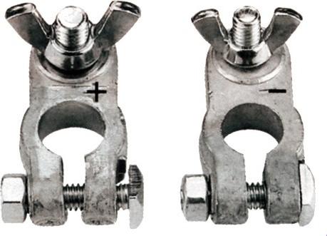 Sett med pluss og minus. Leveres 8 mm bolt på - pol og 10 mm bolt på + pol. Vingemutter for enkel påmontering av kabel.